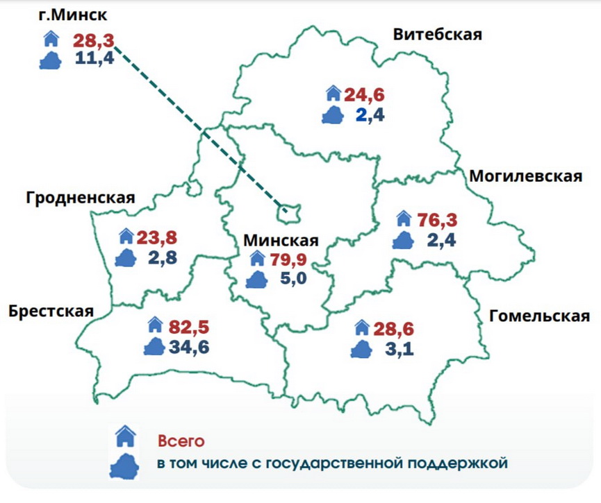 В целом по Беларуси за два месяца 2026 года введено 343,9 тыс. кв. метров жилья. Структура ввода выглядит следующим образом:
