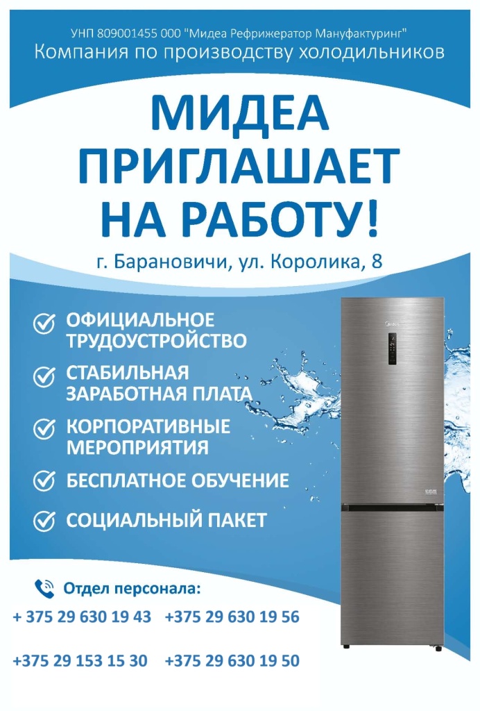 ООО "Мидеа Рефрижератор Мануфактуринг" (г. Барановичи ул. Королика, 8) на постоянную работу требуются: