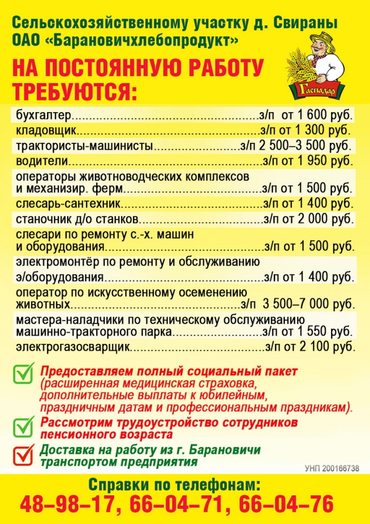 Сельскохозяйственному производственному участку д. Свираны ОАО «Барановичхлебопродукт» требуются
