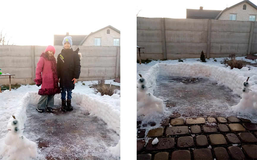 «Меня зовут Зотова Алиса, мне 12 лет. Мы с моим братом и сестрой сделали небольшую постройку из снега, которую назвали «Снежное счастье». Мы использовали снег, веточки деревьев, веточки ёлки, а также краски. Все снежки мы делали отдельно. Мою сестру зовут Ева, ей 7 лет, а моего брата зовут Никита, ему 9 лет. Мы живём в городе Барановичи. Нам бы очень хотелось попасть к вам на канал. Заранее огромное спасибо!».