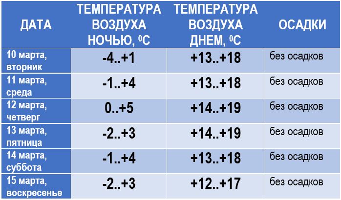 Будет малооблачно и без осадков. Ветер юго-западный, южный, ночью слабый, днем скоростью 5–10 м/с. В ночные часы – от -4 до +1, днем воздух прогреется до +13..+18 по Цельсию.