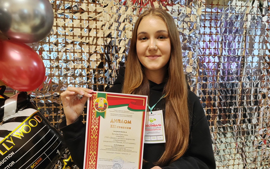 Диплом III степени завоевала Кристина Бугаева, учащаяся Дворца детского творчества г. Барановичи, в открытом фестивале детского и молодежного киновидеотворчества в г. Речица. Конкурс прошел под эгидой ЮНЕСКО. В нем приняло участие множество творческих объединений из 78 учреждений образования со всей Беларуси, кроме того, в числе двух сотен участников – ребята из Брянской области. Фестиваль посвящен 80-летию со дня Победы в Великой Отечественной войне и Году благоустройства. Конкурсные номинации – соответствующие: «Архитектурное наследие моей страны», «Память о прошлом…», «Красоты моего города», а заглавная тема мероприятия – «Между прошлым и будущим».