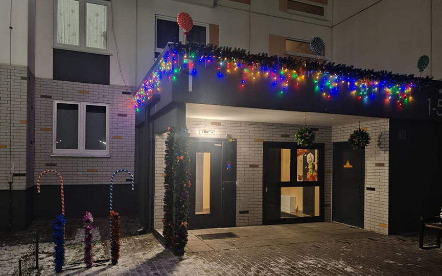 В микрорайоне Боровки на улице Волошина, 36, жительница высотки Марина Ковелько и ее соседи создают праздничное настроение. Двор, входная группа в подъезд, лифт украшены огоньками, тематическими композициями, стикерами. Как вам?