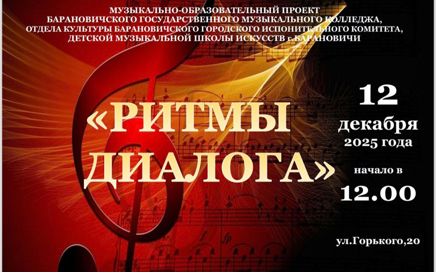 12 декабря впервые состоится совместный музыкально-образовательный проект Барановичского государственного музыкального колледжа, отдела культуры Барановичского горисполкома и детской музыкальной школы искусств г. Барановичи «Ритмы диалога».