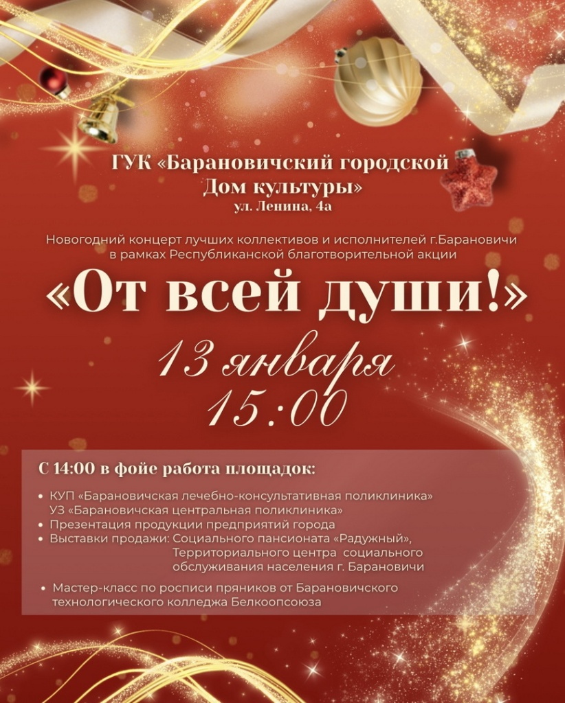 Республиканская благотворительная акция «От всей души» продолжается и 13 января принимает формат новогоднего концерта лучших коллективов и исполнителей города. Он пройдет в Барановичском городском Доме культуры (улица Ленина, 4А). Начало концерта – в 15:00.