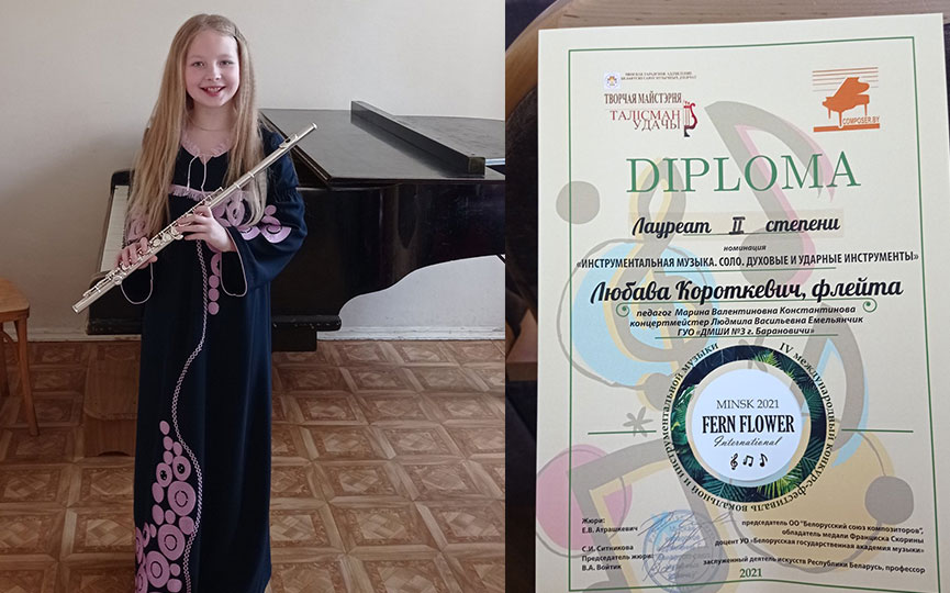 Дипломом лауреата II степени IV Международного конкурса-фестиваля «Fern Flower International» («Папараць-кветка») награждена ученица ДМШИ № 3 Короткевич Любава (флейта).