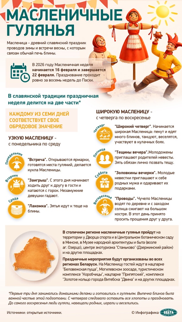 В 2026 году Масленичная неделя начинается 16 февраля и завершается 22 февраля. Празднование проходит ровно за восемь недель до Пасхи. В славянской традиции праздничная неделя делится на две части: Узкую Масленицу - с понедельника по среду, и Широкую - с четверга по воскресенье. Каждому из семи дней соответствует свое обрядовое значение.