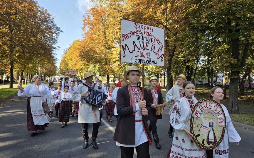 Особым моментом стало праздничное шествие: барановичские ребята с гордостью пронесли штандарты города и ансамбля, сопровождая это песнями и танцами.