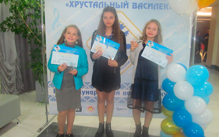"Наши победы на конкурсе "Хрустальный василёк": Ангелина Статковская - лауреат 3-й степени (эстрадный вокал, соло), Милена Юрчик - лауреат 3-й степени в номинации "Патриотическая песня", Ангелина Бирюкова - дипломант 3-й степени!