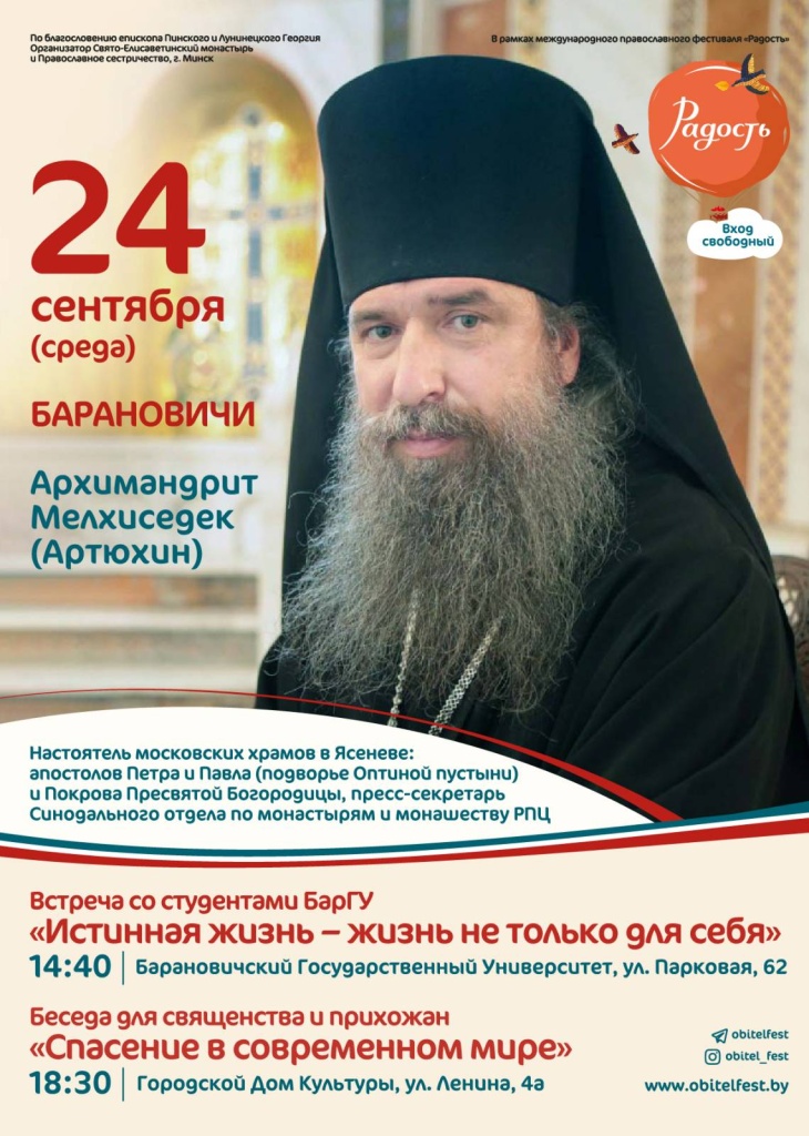 24 сентября в наш город прибудет архимандрит Мелхиседек. Настоятель московских храмов апостолов Петра и Павла и Покрова Пресвятой Богородицы в Ясеневе является еще и пресс-секретарем Синодального отдела Русской православной церкви по монастырям и монашеству. Услышать беседы представителя высокого сана о смысле жизни и спасении в современном мире смогут не только студенты БарГУ, но и прихожане и священнослужители Барановичского церковного округа.