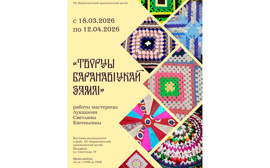 C 18 марта по 12 апреля в фойе Барановичского краеведческого музея продолжается цикл выставок работ мастеров Барановичского края – «Творцы Баранавіцкай зямлі». Новая выставка работ мастерицы Светланы Лукашени – шитье из лоскута и вязание крючком мягких игрушек.