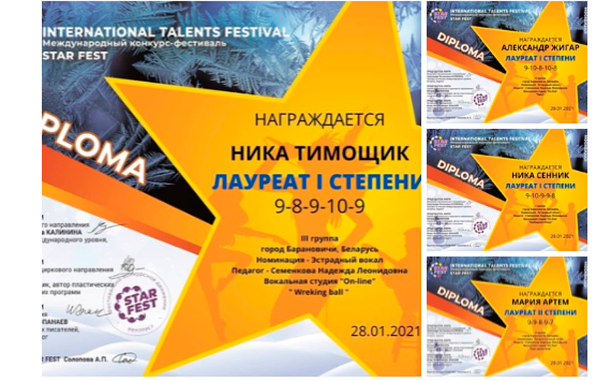 Очередные достижения – у талантливых учениц барановичской школы эстрадного вокала On-line. Сразу три начинающие певицы завоевали призовые места на открытом дистанционном творческом конкурсе «Таланты дома», проводимом Гродненским областным методическим центром народного творчества.
