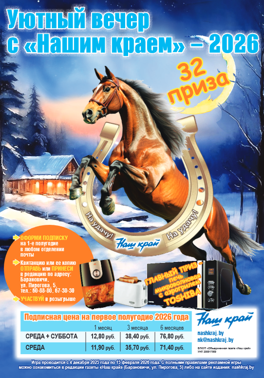 Подписной абонемент или его копию можно передать Организатору по адресу: 225409, Республика Беларусь, Брестская область, город Барановичи, ул. Пирогова, д. 5, опустив ее в специальный ящик, установленный в редакции, или прислав почтой по тому же адресу с пометкой «Рекламная игра». Срок получения писем почтой не позднее 12.01.2026. Прием подписных абонементов непосредственно у Организатора прекращается 14.01.2026 в 16.00.