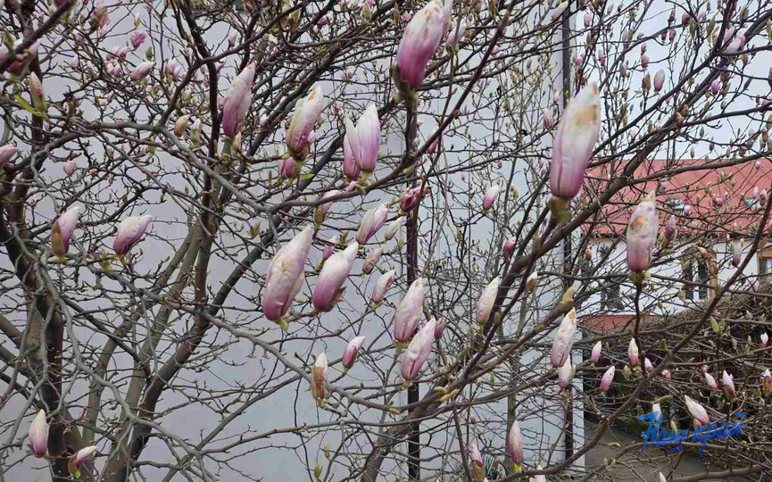 Белоснежный наряд расцветших в городе в апреле деревьев разбавила нежно-розовым цветом магнолия. Эта южная красавица распустила свои крупные изящные цветки на улице Шевченко, у костела Матери Божьей Фатимской.