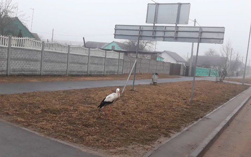 Житель города Барановичи наблюдал сегодня такую картину: аист ходил по тротуару в Боровках на улице Чернышевского.