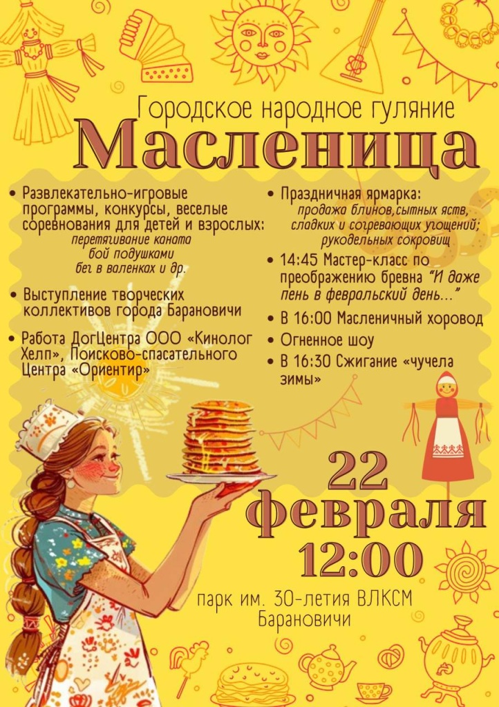 Приходите всей семьей! Ведь МАСЛЕНИЦА – это прекрасная возможность окунуться в атмосферу народного праздника, попробовать традиционные угощения и зарядиться весенним настроением!