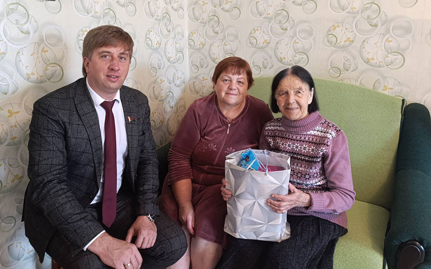 Она рассказала о своей жизни, о тяготах, которые выпали на ее долю: военные годы, восстановление послевоенной разрухи, воспитание детей. Депутат от себя лично, от имени горисполкома, управления по труду, занятости и социальной защиты вручил Клавдии Александровне подарок. Сегодня она благодарит за внимание к ней, за подарки и желает, чтобы в стране, самое главное, были мир и спокойствие.