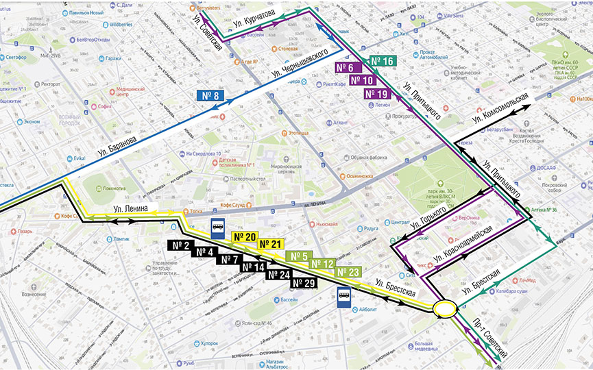 Маршруты № 2, 4, 7, 14, 24, 29 – … ул. Ленина, Брестская, Красноармейская Притыцкого, Комсомольская…. В обратную сторону – … ул. Комсомольская, ул. Притыцкого, Горького, Брестская, Ленина… (дополнительные остановки при движении в сторону ул. Советская – ул. Димитрова, при движении в сторону стадиона в кармане магазина «Ами Мебель» и м-на «Цвік»).