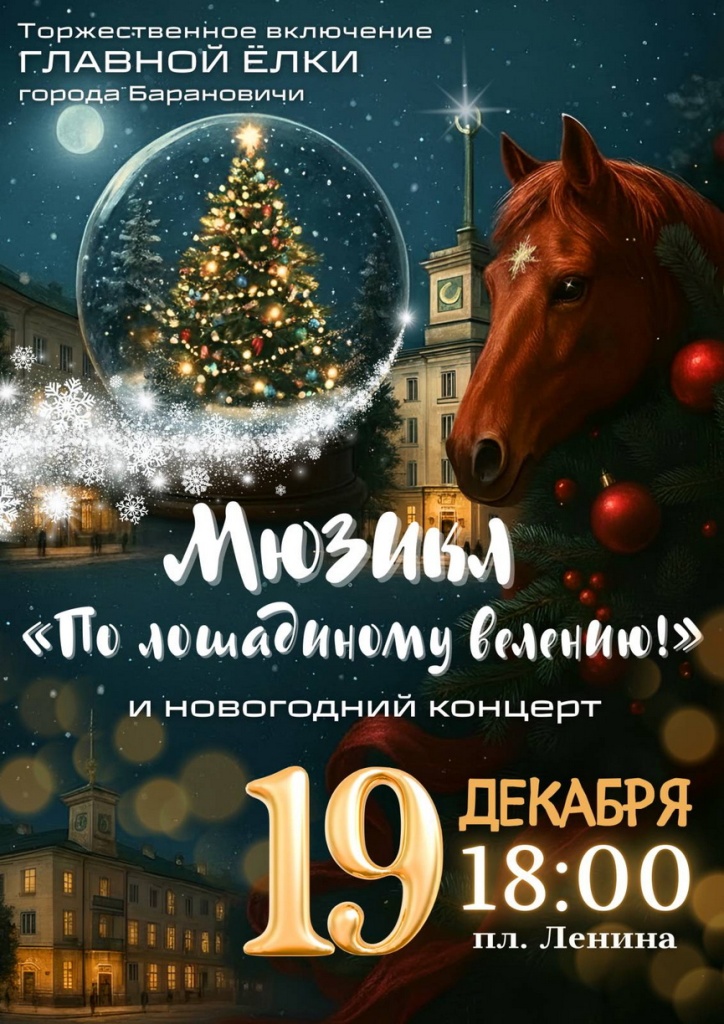19 декабря в 18.00 приглашаем вместе зажечь огни на главной елке Барановичей! На празднике вас ждет яркий мюзикл для детей и взрослых «По лошадиному велению» и зажигательный новогодний концерт.