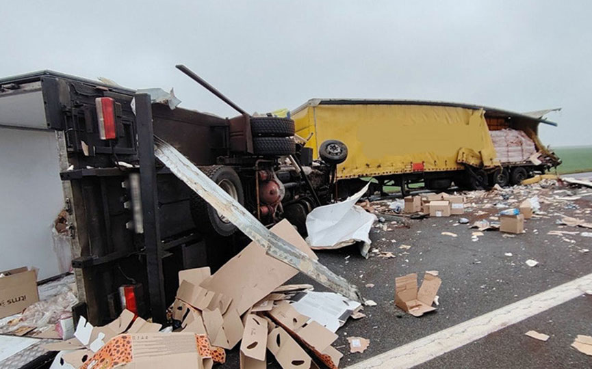В результате ДТП никто не пострадал. Один из грузовиков опрокинулся, перевозимая продукция оказалась на проезжей части.