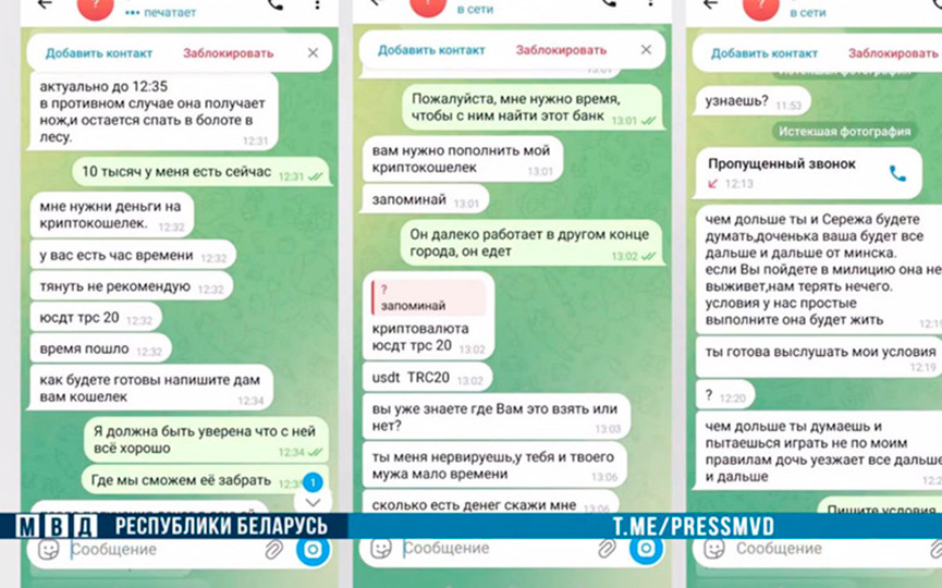 В столичную милицию обратилась минчанка, которой позвонил неизвестный и сообщил: ее 15-летняя дочь похищена. Женщине присылали фото ребенка и комнат квартиры, требуя перевести деньги на криптокошелек. Мать сообщила о случившемся в милицию и поехала домой, девочки там не оказалось. Сыщики в течение двух часов нашли ее в загородном кафе в полном порядке.